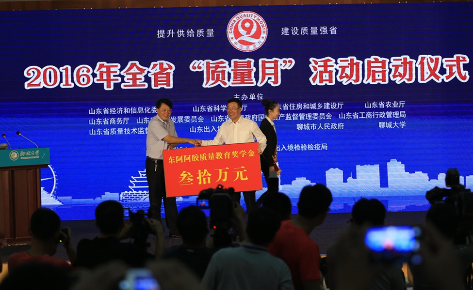 今年我省确定的“质量月”活动的主题是:提升供给质量,建设质量强省。启动仪式上,全国质量奖、省长质量奖企业东阿阿胶集团向聊城大学赞助30万元设立质量教育奖学金,并代表300余家参加仪式的企业向全省企业发出倡议,将每年9月6日设为“企业质量日”,倡议全省广大企业,把质量放在更加重要的位置,积极响应建设质量强市、质量强省、质量强国的号召,广泛开展质量提升活动,向社会和消费者提供更多、更好、更有品质的产品及服务,为加快建设经济文化强省做出新的更大贡献;聊城大学校长马春林、第一批质量学院本科学生代表表态发言,努力为全省质量发展培养急需的创新型质量专业人才;质检总局原副局长魏传忠、省政府办公厅副主任卢杰为全省质量教育培训基地揭牌;聊城市政府副市长洪玉振、省科技厅巡视员徐茂波为山东省人造板产品质量检测中心(筹)揭牌;省局副局长张健、省检验检疫局纪检组长孙江功为山东省化肥产品质量检测中心(筹)揭牌。随后,省政府办公厅副主任卢杰宣布全省“质量月”活动正式启动,各地按计划开展质量宣传活动,实施质量提升行动,广泛组织开展形式多样的群众性质量活动,营造出“政府重视质量、企业追求质量、社会崇尚质量”的文化氛围。